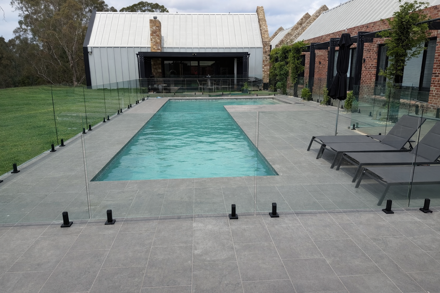 Surrounding the pool is a large-format tiled terrace, providing a cohesive, low-maintenance finish that complements the brickwork and steel elements of the home. The frameless glass fencing maintains safety while preserving clear sightlines across the courtyard and into the landscaped surrounds, keeping the space open and visually connected.